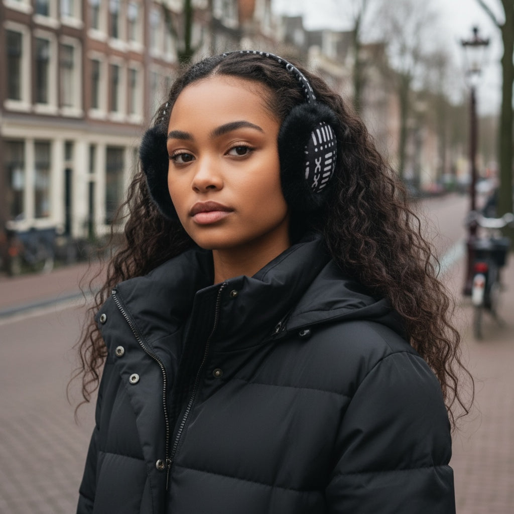 Afrikaanse Print Oorwarmers / Earmuffs - Inklapbaar Wintermodel - Zwart Witte Bogolan