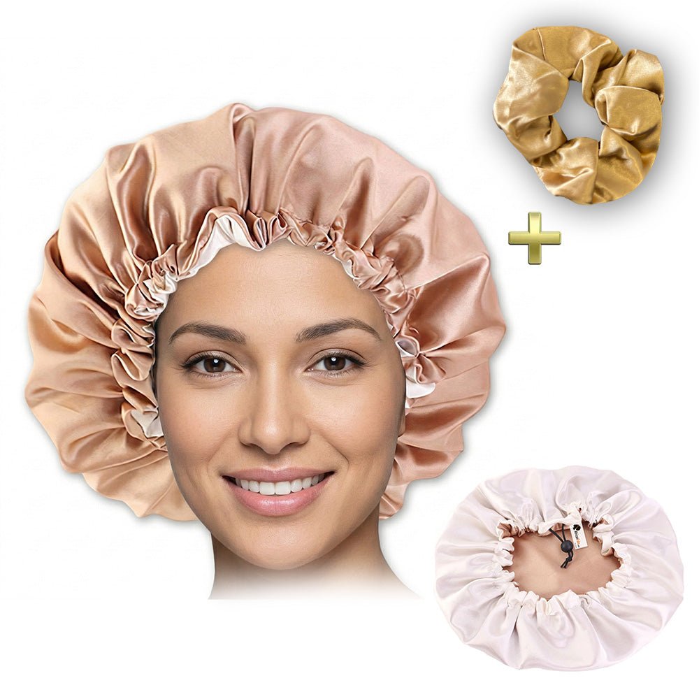 Deze slaapmuts en satijnen scrunchie beschermen je haar optimaal. De bonnet kan ook binnenstebuiten gedragen worden, waardoor de buitenkant de lichte kleur is, en de binnenkant de donkere kleur.