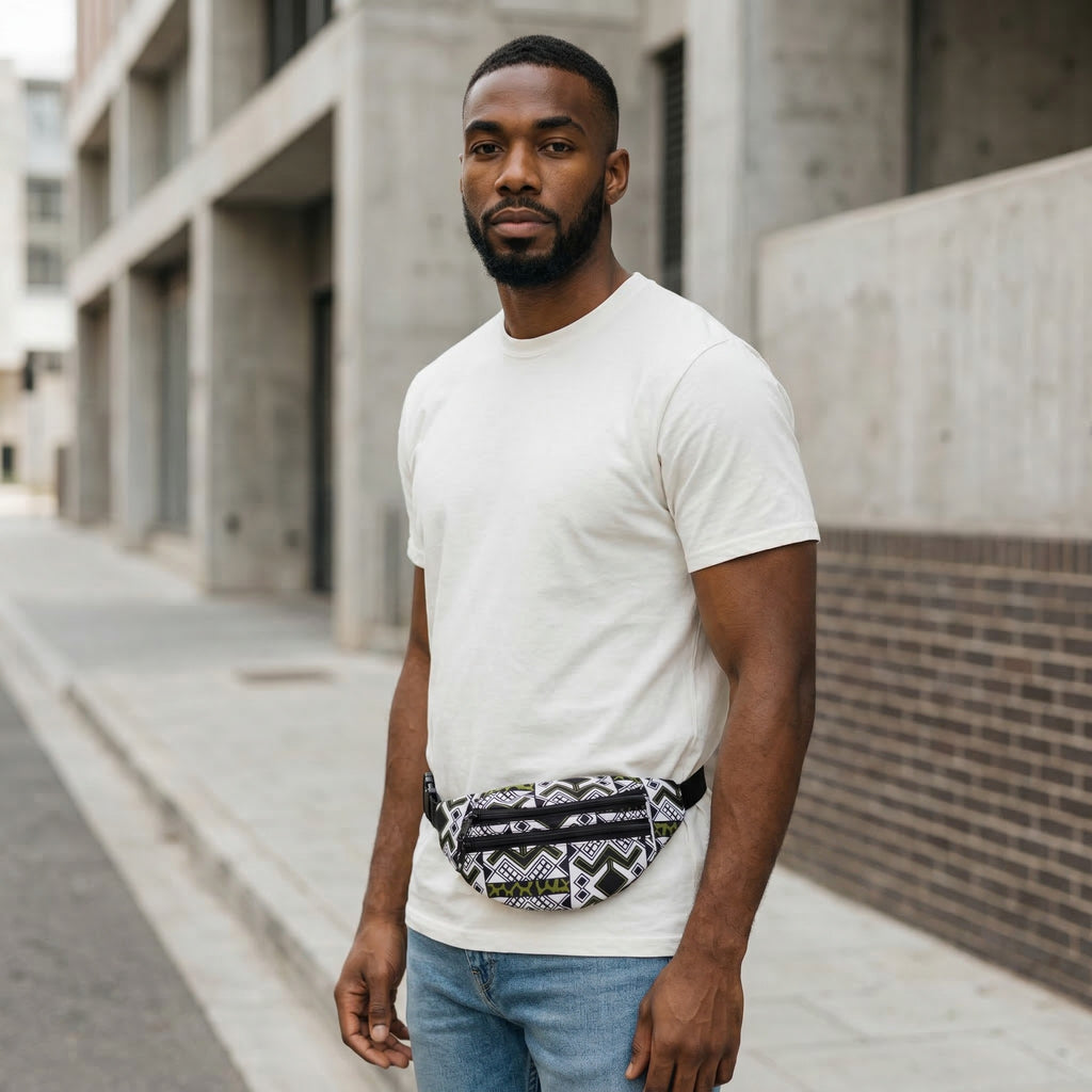 Afrikaanse print heuptasje / Fanny pack - Wit groene bogolan - Festival tasje met verstelbare band